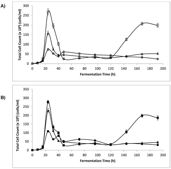 (A) Total cell count (cells/mL) of non-NaCl-stressed cells during various fermentation times (h) with three different media containing 200, 300, or 400 g/L glucose after cell treatment with sonication (n = 3 replications for each time and error bars represent standard deviation of the average value of all replications with each range of fermentation time); (B) Total cell count (cells/mL) of NaCl-stressed cells during various fermentation times (h) with three different media containing 200, 300, or 400 g/L glucose after cell treatment with sonication (n = 3 replications for each time and error bars represent standard deviation of the average value of all replications with each range of fermentation time) (○): (200 g/L glucose, 0% NaCl), (∆): (300 g/L glucose, 0% NaCl), (□): (400 g/L glucose, 0% NaCl), (●): (200 g/L glucose, 6% NaCl), (▲): (300 g/L glucose, 6% NaCl), (■): (400 g/L glucose, 6% NaCl).