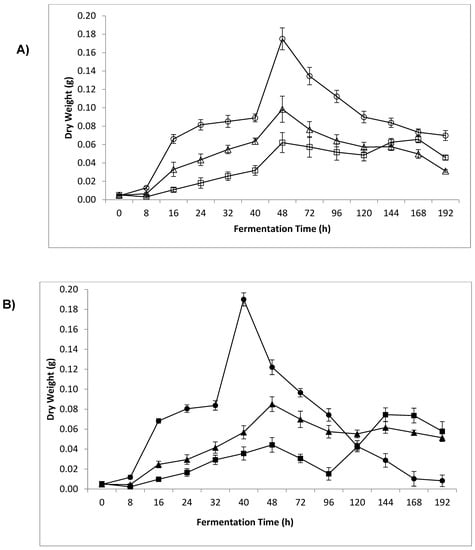 (A) Dry weight (g) of a 50-mL sample of non-NaCl-stressed cells during various fermentation times (h) with three different media containing 200, 300, or 400 g/L glucose (n = 3 replications for each time and error bars represent standard deviation of the average value of all replications with each range of fermentation time); (B) Dry weight (g) of a 50-mL sample of non-NaCl stressed cells during various fermentation times (h) with three different media containing 200, 300, or 400 g/L glucose (n = 3 replications for each time and error bars represent standard deviation of the average value of all replications with each range of fermentation time) (○): (200 g/L glucose, 0% NaCl), (∆): (300 g/L glucose, 0% NaCl), (□): (400 g/L glucose, 0% NaCl), (●): (200 g/L glucose, 6% NaCl), (▲): (300 g/L glucose, 6% NaCl), (■): (400 g/L glucose, 6% NaCl).