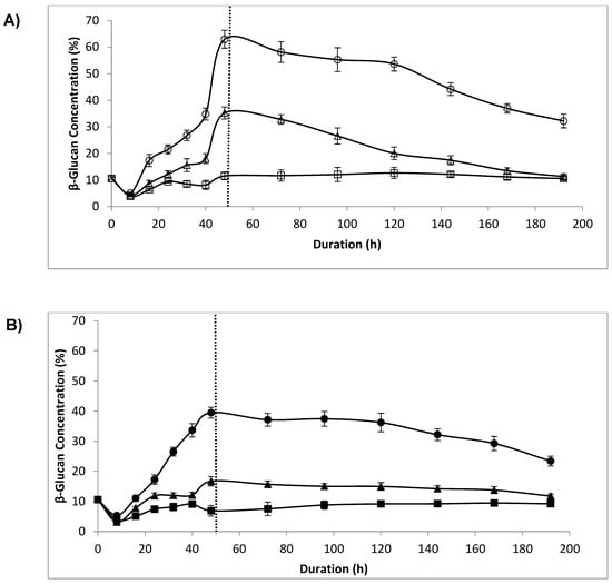 In non-continuous fermentation, during the transition from the exponential to the stationary phase, the action of β-1,3-glucan synthetase decreases while the action of glycogen synthetase increases []. During the exponential phase, the autolytic action of endo β-glucanases is higher compared to that in the stationary phase of yeast cells’ growth, while a significant increase in endoglucanases’ activity into the soluble fraction of β-glucan during the stationary phase in non-continuous fermentation of Saccharomyces exiguus has also been reported []. The stationary phase is characterised by carbon limitation, and as the cell culture enters this, more glucan is necessary for the maintenance of the cell’s viability []. The higher β-glucan concentration at the stationary phase can also be explained by the decreased action of cell’s glucanases, with the less active cell’s growth at the exponential phase, which is accompanied by a non-severe carbon limitation, similar to the one at the end of the stationary phase []. During aerobic fermentation, when yeast cells enter the stationary growth phase, the cells become more resistant to the action of β-1,3-glucanase and are less permeable to macromolecules with the expression of Sed1p protein [,].