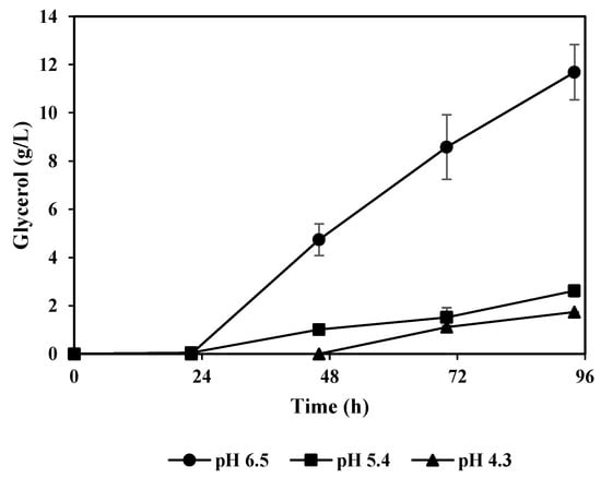 With the intensification of biodiesel production as a fuel replacement to diesel, the worldwide production of glycerol has concomitantly increased. Due to its surplus, the price of glycerol will have the tendency to decrease. Therefore, instead of considering glycerol as a final product, it is also considered in this study as a potential carbon source for A. oryzae. The fungus was grown in a semi-synthetic medium containing about 27 g/L glycerol as the sole carbon source together with magnesium, calcium, potassium, and ammonium salts, where the effect of absence or presence of yeast extract was investigated. As presented in Figure 5, when the medium was supplemented with yeast extract, 95% of the initial glycerol in the medium was consumed within 96 h of cultivation, while only 10% of the initial glycerol was consumed when yeast extract was absent. The results are in compliance with 7.09 ± 0.78 and 0.61 ± 0.13 g/L of biomass produced in cultivation media supplemented or not with yeast extract, respectively.