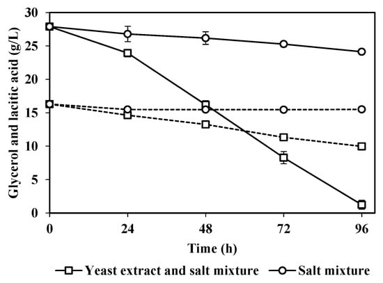 Utilization of lactic acid (dashed line) and glycerol (solid line) by A. oryzae in mediums supplemented with salt mixture (○) or salt and yeast extract (□).