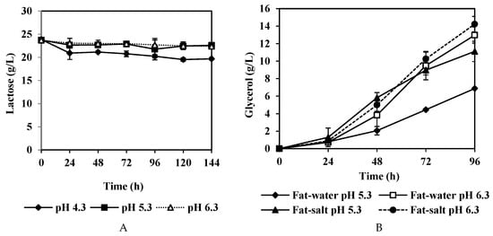 The changes in the (A) lactose content of the fat-free cream fraction inoculated with A. oryzae at different pH values and (B) glycerol concentration of the cream fat fraction inoculated with A. oryzae at different pH values and medium compositions.