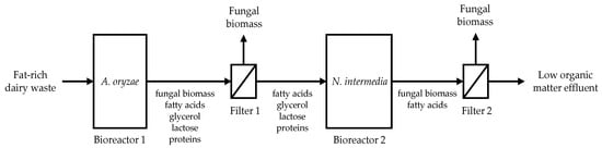 The present study adds further insights into process requirements for full conversion of the nutrients in dairy waste to value-added products. A. oryzae has previously been found to change its metabolic preference, where fat degradation is preferred over lactose assimilation in fat-rich media and vice-versa. Such an expressive metabolic shift (based on the amount of glycerol released) has not been found for Neurospora intermedia, where lactose consumption assumes the highest relevance independently of the medium used [3]. Such performance differences call for an integrated process where both fungi are used in series (Figure 7) within a biorefinery-based concept for valorization of dairy waste. Overall, fat-rich dairy waste can be diluted with sour milk, cheese whey, or any other low-fat waste material to a fat content within 10–40% and used for cultivation with A. oryzae in a first bioreactor under aerobic conditions. During this first stage, A. oryzae will degrade fat and likely proteins, releasing fatty acids and glycerol. The medium is filtrated into a second aerobic bioreactor where N. intermedia receives a stream rich in lactose, lactic acid, glycerol, and fatty acids and produces biomass that can be easily separated by sieving and sold possibly for animal feed or human food applications. Despite the edible character of A. oryzae, further studies need to be performed within the overall process development in order to evaluate its suitability for animal feed or human consumption, since the growth substrate will be very heterogeneous. Depending on the conditions applied, the final liquid fraction should be very low in organic matter, which eases water recycling, and with fatty acids that can also have feed or human food applications. Further studies are needed in order to investigate the process performance at reactor scale and the influence of, for example, oxygen. Altogether, filamentous fungi can be used to tackle a social and environmental problem of increasing amounts of dairy waste, via building an integrated bioconversion process that can supply several different products into various industrial sectors.
