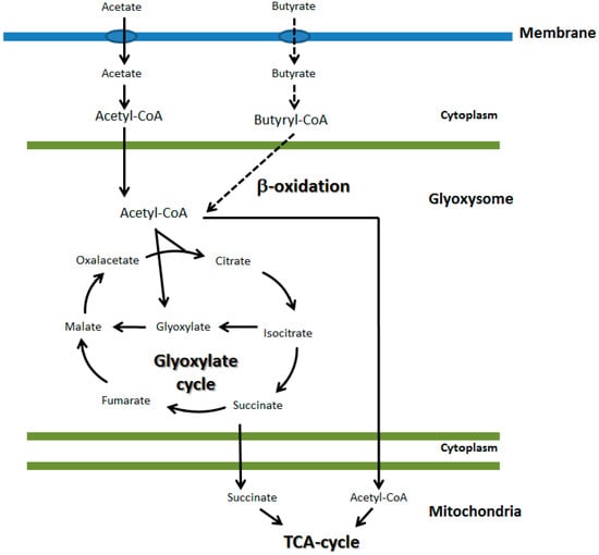 Butyrate is another major by-product of dark fermentation, but butyrate assimilation by microalgae has not yet been studied in such detail. Butyrate has relatively higher molecular weight and associated complicity and requires more steps for conversion to acetyl-CoA. Similar to transport of acetate, it can be anticipated that butyrate enters via a monocarboxylic/proton transporter across the membrane. In the glyoxysome, butyrate is converted to acetyl-CoA through β-oxidation [43]. The acetyl-CoA is partially used via the glyoxylate cycle for biosynthesis, as well as via the TCA cycle for energy production (Figure 1). For both metabolic cycles, acetyl-CoA is a prerequisite and is mainly provided by β-oxidation [46]. Although acetate can be efficiently converted into lipids, butyrate uptake by microalgae is much slower and can reduce the microalgae growth when both VFA are present. This problem can be solved either by increasing the initial microalgae biomass or by increasing the initial acetate: butyrate ratio [31].