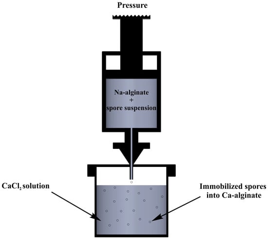 The bacteria cells (4.5% v/v each strain) were dispersed in different concentrations of sterile Na-alginate solution (1–3% w/v). Different concentrations (0.1–0.3 M) of sterile calcium chloride solutions were also prepared. The Na-alginate solution was then polymerized to form a gel. As shown schematically in Figure 1, the cell suspension was extruded through a tube (diameter 0.25 mm) and injected through a nozzle into a sterile solution of calcium chloride at a constant rate, while the solution was continuously shaken. The beads were formed upon injection and the bacterial cells were entrapped accordingly. To increase the structural integrity of the fabricated beads, the mixture of calcium chloride was stirred for 20 min. Afterwards, a strainer was used to harvest the immobilized cells.