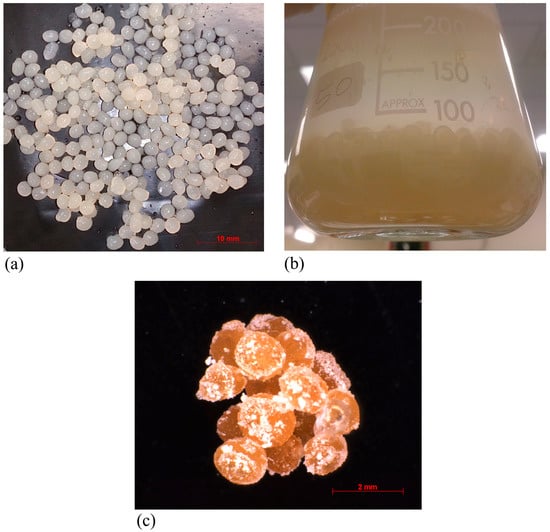 (a) Immobilized bacterial cells into Ca-alginate beads; (b) fermentation medium inoculated with immobilized bacterial cells; and (c) precipitated CaCO3 crystals around Ca-alginate beads.
