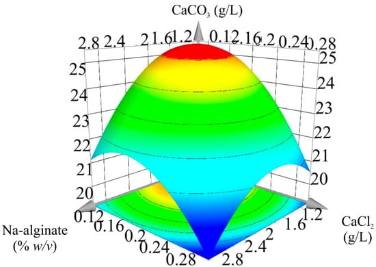 In Figure 3, a 3D response surface plot was constructed to illustrate the synergistic effects of Na-alginate and CaCl2 concentrations on the response (CaCO3) and also provide a visual interpretation for the location of the optimal concentrations. The shape of the corresponding plots shows that the mutual interaction between variables is significant, and the response was considerably affected by the concentrations of Na-alginate and CaCl2.