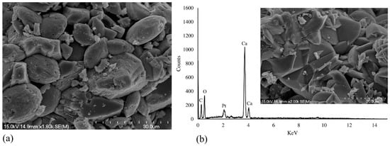 (a) Scanning electron microscopy (SEM) micrograph of precipitated CaCO3 crystals using immobilized bacterial cells into Ca-alginate and (b) energy dispersive X-ray spectroscopy (EDS) spectra of the induced CaCO3 crystal.