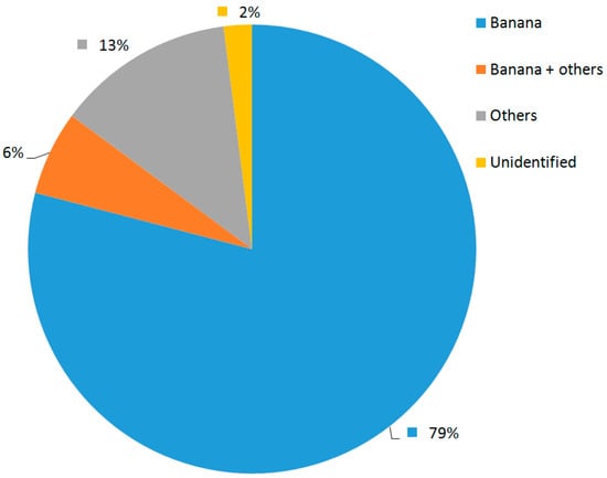 - Facundo, H.V.V.; Garruti, D.S.; Dias, C.T.S.; Cordenunsi, B.R.; Lajolo, F.M. Influence of different banana cultivars on volatile compounds during ripening in cold storage. Food Res. Int. 2012, 49, 626–633. [Google Scholar] [CrossRef]