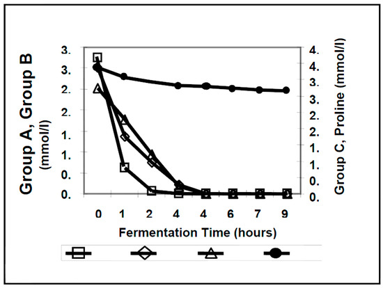 Amino acid absorption pattern during wort fermentation [40,41].