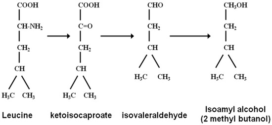 - Ehrlich, F. Über die Bedingungen der Fuselölbildung und über ihren Zusammenhang mit dem Eiweissaufbau der Hefe. Ber. Dtsch. Chem. Ges. 1907, 40, 1027–1047. [Google Scholar] [CrossRef]
