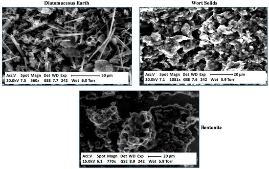 Carbon dioxide concentrations during the fermentation of the wort types have been determined (Table 6) [32]. Cloudy wort, containing trub, and wort containing DE acted as nucleation sites and this increased CO2 evolution out of the wort. Bentonite did not function as a nucleation site with clear wort. Consequently, the CO2 remained in the fermentation medium to a greater extent. Why was there a difference between trub, DE and bentonite? In order to examine each type of particle and obtain data on their surface characteristics, environmental confocal scanning electron microscopy (ESEM) was conducted (Figure 10) [55]. DE consisted of a heterogeneous mix of shapes and sizes of particles. The surface of most of the particles consisted of an extremely porous structure, as would be expected. The micrograph of the cloudy wort solids showed a mix of different structures, again porous in nature. Bentonite demonstrated a more homogenous structure. It did not appear to exhibit the same porous nature as DE or wort solids.
