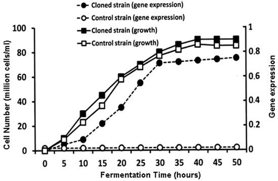 Expression of the ATF1 gene during fermentation. Cells cultured (with shaking) in yeast extract–peptone–glucose medium at 21 °C. Control strain (growth) (□); cloned strain (growth) (●); control strain (gene expression) (○); cloned strain (gene expression) (■) [54].
