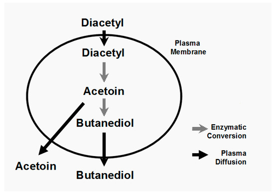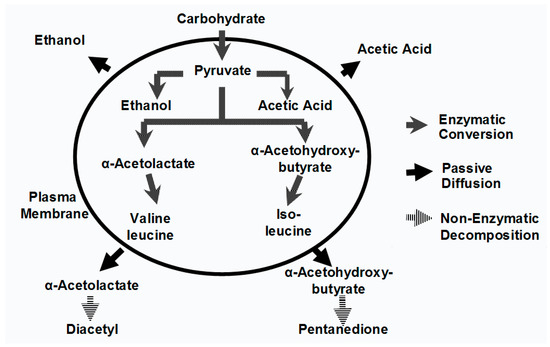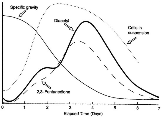 Although microbial contamination can be responsible for diacetyl formation [7,85], yeast metabolism and its management are the major routes and this is why it is discussed in detail here. It has already been discussed that diacetyl and 2,3-pentandione are formed indirectly because of valine and isoleucine biosynthesis. They arise from the spontaneous non-enzymatic oxidative decarboxylation of α-acetohydroxy acids that are intermediates in valine and isoleucine biosynthesis pathways [87] (Figure 12). Valine and isoleucine synthesis occurs in the mitochondria [88]. The reaction between α-acetolactate and 2,3-dihydro-isovalenate is rate-limiting, and thus during fermentation and yeast growth, α-acetolactate is secreted through the cell’s plasma membrane into the wort [89]. Recovery and mechanisms for α-acetolactate secretion are not fully understood, but may involve protecting the yeast from carbonyl stress [90]. The α-acetolactate is then spontaneously decarboxylated, oxidatively or non-oxidatively, forming diacetyl or acetoin respectively, and in both cases releasing carbon dioxide. The non-oxidative decarboxylation of acetoin can be enhanced by heating under anaerobic conditions and by maintaining a low redox wort potential [91]. Diacetyl production is enhanced with increasing valine biosynthesis, which depends on the cell’s access to valine and other amino acids. Fermentation conditions favouring rapid yeast growth give rise to increased diacetyl production if the wort’s free amino nitrogen content is insufficient. The diacetyl and “total diacetyl” concentrations during a typical lager fermentation are depicted in Figure 13. During a typical wort fermentation, the concentration of free diacetyl in wort is usually low whereas α-acetolactate constitutes the majority of the “total diacetyl” [91]. As a result, diacetyl concentrations are often expressed as “total diacetyl” concentrations, that is, the sum of free diacetyl and α-acetolactate (“potential diacetyl”), during analysis in order to highlight the potential diacetyl concentration in fermenting wort.