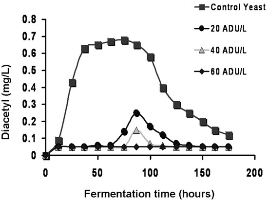 Valine and isoleucine addition to fermenting wort during the production of diacetyl has found that increased wort valine concentrations significantly reduces the amount of diacetyl produced during fermentation [93]. During fermentation trials with lager yeast strains involve wort with a spectrum of original gravities, free amino nitrogen (FAN) and valine concentrations. It was observed [94] that low levels of valine in wort resulted in the formation of double-peak diacetyl profiles (most likely as a result of valine depletion towards the end of fermentation). However, high concentrations of wort valine resulted in single-peak diacetyl profiles with lower maximum diacetyl levels compared to the wort with low valine concentrations. Wort valine concentrations influence the amount of diacetyl formed but as the wort employed in these studies varied in specific gravity and FAN, no definite conclusions regarding a relationship between wort valine and diacetyl concentrations can occur. Trials with two dried lager yeast strains concluded that diacetyl concentrations in fermenting wort were constant or decreased when valine uptake increased, while diacetyl concentrations increased when valine uptake decreased [95]. Direct supplementation of wort with valine (100–300 mg/L) and consequently greater uptake of valine by yeast, resulted in less diacetyl being formed during fermentation. However, other fermentation parameters such as fermentation rate and yeast growth were unaffected [96]. The same series of fermentation trials showed that when wort FAN levels were reduced, diacetyl production was also decreased. This effect is presumably due to faster absorption of preferred amino acids [40,41,46], resulting in an earlier and enhanced demand for valine and its increased uptake due to less competition for amino acid permease interactions. Increased background levels of initial wort amino acids (maintaining the valine concentration constant) resulting in greater production of diacetyl. The maximum diacetyl concentration during fermentation decreased as the initial wort FAN concentrations were increased from 122 to 144 mg/L. It has also been reported [97] that lower diacetyl production rates and increased valine uptake occurred during the fermentation of 18°Plato adjunct containing wort (FAN content approximately 150–210 mg/L) compared with an all-malt 18°Plato wort (FAN content approximately 300 mg/L). The conflicting diacetyl results are presumably due to differences in valine uptake rate and extent.
