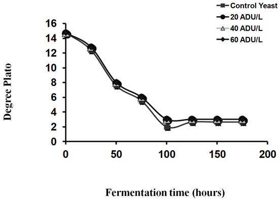 Concentration of CO2 (g/L) present during fermentation of 15°Plato worts [32].