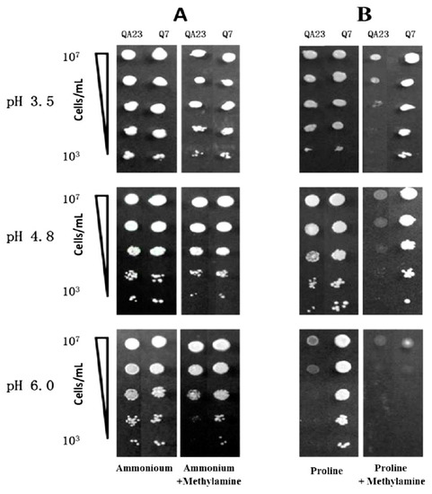 Growth of QA23 and EMS isolate Q7 on: (A) YNB with ammonium (±methylamine); (B) YNB with proline (±methylamine) at pH 3.5, 4.8 and pH 6.0. Five × ten-fold serial dilutions of yeast cell suspensions (initially at OD 0.08) were applied to each plate. Plates were photographed after 3 days incubation at 28 °C.