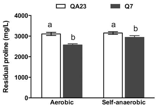 Proline consumption by QA23 and Q7 following fermentation in CDGJM as described in Figure 2, under aerobic and self-anaerobic conditions. The medium initially contained 3.3 g/L proline. Results are mean of three culture replicates (±standard error). Histograms identified with different letters were significantly different within a given condition.
