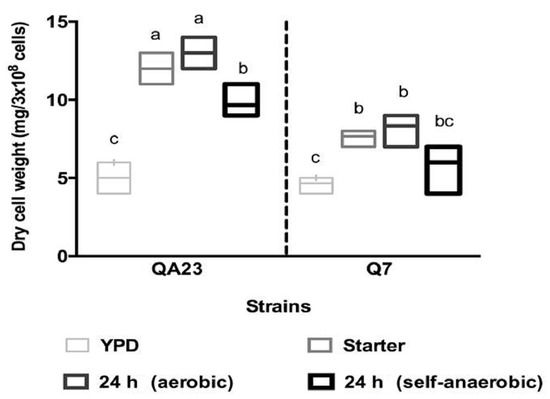 Comparison of dry cell weights 24 h after inoculation of QA23 and EMS isolate Q7 in yeast extract peptone dextrose (YEPD), starter, and fermentation media (as described in Figure 2). Results are the mean of three replicates. Values identified with different letters were significantly different.