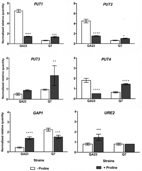 Normalized relative expression of key genes involved in proline transportation and metabolism in QA23 and Q7, cultivated overnight in media containing: 450 mg/L of nitrogen with mixed amino acids and ammonium, but without proline (−proline); or 50 mg/L mixed amino acids and ammonium, supplemented with 3.3 g/L proline (+proline). Initial sugar content of each medium was 100 g/L of glucose: fructose 1:1. The mRNA level of each gene was normalized against TAF10 and ALG9 levels in the same sample. Values are mean (± standard error) of duplicate determinations from duplicate cultures. Data analysis was performed using qbase+ software. Significant differences in relative expression are indicated by: *, p < 0.05; **, p < 0.01; ***, p < 0.001; ****, p < 0.0001.
