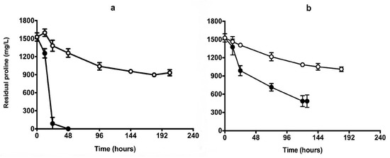Proline consumption during fermentation in aerobic (a) and self-anaerobic conditions (b). Fermentation conditions as described in Figure 6. The open and closed symbols represent QA23 and Q7, respectively. Results are the mean of triplicates.