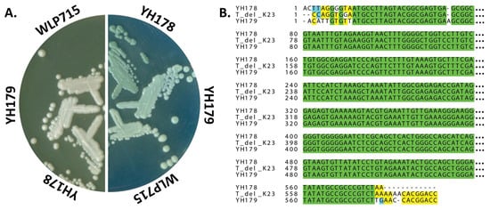 YH178 and YH179 are both strains of T. delbrueckii. (A) Colony morphology of YH178, YH179, and S. cerevisiae WLP715 on YPD (left) and WLN (right) agar plates. The indicated strains were streaked for single colonies and grown at 30 °C for 2 days prior to capturing images of the plates with a flatbed scanner. (B) Sequence alignments revealed that YH178 and YH179 are isolates of T. delbrueckii. A portion of the 26S rDNA of YH178 and YH179 was PCR-amplified and sequenced, and the sequences are aligned to the closest related strain in the NCBI nucleotide database. T_del_K23 denotes the 26S rDNA gene of T. delbrueckii strain K23 (GenBank accession KP852445.1). The ellipsis at the end of each line represents the missing sequence that was truncated due to spatial constraints. The full alignment is shown in Figure S1. Green: fully conserved; yellow: conserved among two sequences; blue: similarity (pyrimidines); dashes: sequence gaps due to indels.