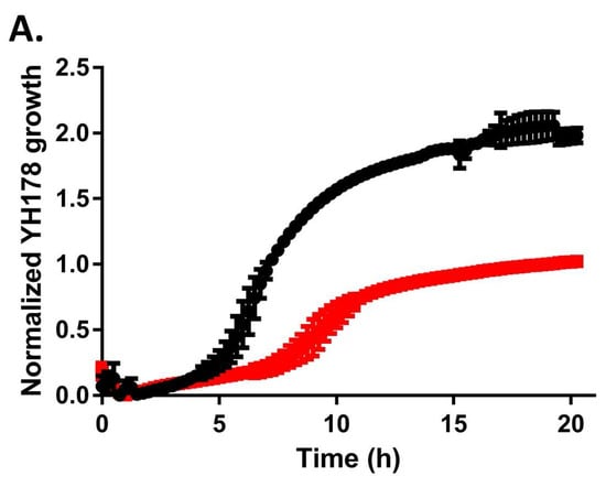 YH178 and YH179 were identified as T. delbrueckii using the procedure described in [8]. Briefly, 100 µL of saturated overnight culture was mixed with an equal volume of lysis solution (0.2 M LiOAc and 1% SDS) and incubated in a 65 °C water bath for ≥15 min to lyse the cells. The genomic (gDNA) was precipitated with 300 µL of 100% isopropanol and vortexing, and it was pelleted with cell debris for 5 min at maximum speed in a microcentrifuge. The supernatant was removed, and the gDNA was resuspended in 50 µL TE buffer (10 mM Tris-HCl, pH 8, and 1 mM EDTA). The variable D1/D2 portion of the eukaryotic 26S rDNA was then amplified by PCR from the gDNA templates using oligos NL1 (GCATATCAATAAGCGGAGGAAAAG) and NL4 (GGTCCGTGTTTCAAGACGG) [32] and the following cycling conditions: 98 °C for 5 min; 35 cycles of 98 °C for 30 s, 55 °C for 30 s, and 72 °C for 30 s; and 72 °C for 10 min. The amplified DNA was purified using a PCR Purification Kit (Thermo Scientific, Waltham, MA, USA) and sequenced by ACGT, Inc. (Wheeling, IL, USA) using primer NL1. The sequence was used to query the National Center for Biotechnology Information (NCBI) nucleotide database with the Basic Local Alignment Search Tool (BLAST; http://blast.ncbi.nlm.nih.gov/Blast.cgi?CMD=Web&PAGE_TYPE=BlastHome) to identify the most closely related species.