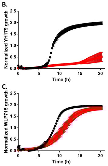 YH178 and YH179 grow poorly in the presence of maltose. YH178 (A), YH179 (B), and S. cerevisiae WLP715 (C) were grown to saturation overnight in YPD medium, back-diluted into YPD (black) or YPM (red) medium, and grown overnight in a 96-well plate. Growth was monitored by recording the OD660 of each culture and is plotted vs. time. The plotted points are the averages of three independent experiments, and the error bars are the standard deviations.