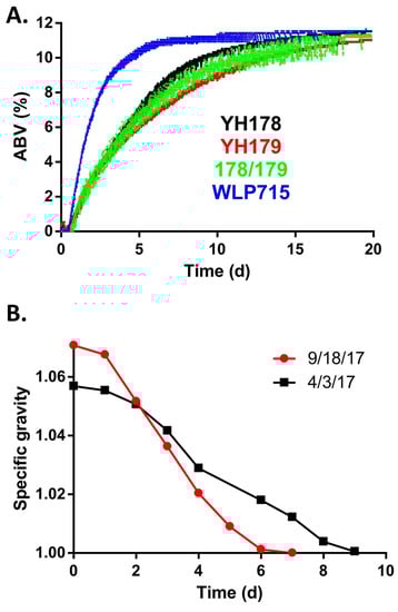Based on the performance of YH178 and YH179 in mead fermentation, we sought to determine how well these strains functioned in production-scale (>20 hL) fermentations. Two large, independent fermentations of diluted honey were conducted as described in the Materials and Methods. A mixed yeast culture containing approximately equal cell counts of YH178, YH179, and WLP715 was used in both cases. As shown in Figure 3B, this yeast blend was able to ferment the solution to a specific gravity of ~1.000 in <10 days during both trials. This is consistent with the kinetics of fermentation displayed by these strains individually in laboratory-scale fermentations (Figure 3A), indicating that YH178 and YH179 can be used for industrial honey fermentations without any additional “domestication” or adaptation, at least in the presence of WLP715. Future experiments with YH178 and YH179 alone are planned, as well as trials of serial re-pitching of these strains into fermentations to select for an increased fermentation rate. Indeed, the desirable rapidity with which WLP715 ferments honey is one of the reasons that it was added to the production-scale fermentations performed in this work. Regardless, the fermented honey solutions were distilled into a schnapps that was back-sweetened with honey and were well received by consumers [31].