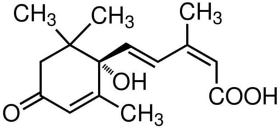 In 1961, an extracted compound from the peel of mature cotton bolls, now known as abscising, was found to induce defoliation [52]. Later, an isolated compound from the leaves of birch and maple trees, now known as dormin, was revealed to trigger a resting state in the trees′ buds [53]. In 1967, abscisin and dormin were combined with the unique name of abscisic acid (ABA) [54]. Structural formula of ABA, a sesquiterpene (С15), is presented in Figure 2. ABA was firstly identified by gas chromatography and mass spectrometry (GC-MS) in brown and green algae [55] and is synthesized in plant tissues with free and bound forms. The bound form results from the interaction of an ester of abscisic acid and d-glucose [56]. In the chloroplasts of green leaves that have stopped growing, ABA is synthesized and transported to other parts of the plant, suppressing growth and inducing a transition to a state of rest [5]. It has also been found that increased ABA content in Nicotiana plumbaginifolia results in delayed seed germination [57]. Accumulating evidence permits the conclusion that ABA (1) induces phylloptosis, closure of the stomata, and ageing, (2) maintains bud and seed dormancy, (3) hinders the syntheses of nucleotides and proteins, and (4) inhibits plant growth [58].