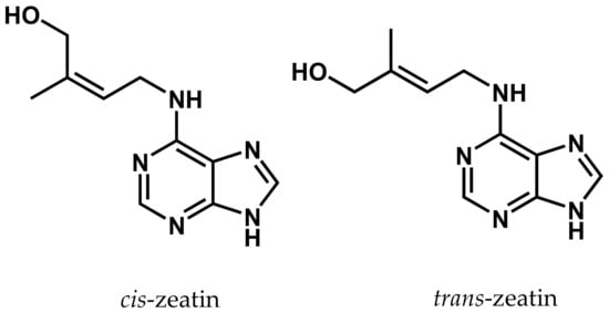 Cytokinins (CKs) are derivatives of purine basic nitrogens of adenine and adenosine, discovered in the middle of the 20th century [68]. In plant tissues, zeatin is a predominant form of CKs and may exist in a cis- or trans-configuration as shown in Figure 3, of which trans-zeatin serves as the most active and widespread isoform of CKs [69,70]. Isoprenoid CKs isopentenyladenine was first identified in Chara globularis by liquid chromatography and mass spectrometry (LC-MS) [71]. However, the cis-zeatin type is the predominant cytokinin in microalgae [72,73], inconsistent with trans-zeatin dominating in plants. Isopentenyladenine-type cytokinins are present in moderate levels, while low concentrations of trans-zeatin and lower concentrations of dihydrozeatintype cytokinins have been identified. In addition, ribotides are common conjugates combined with the cytokinin free bases [73].