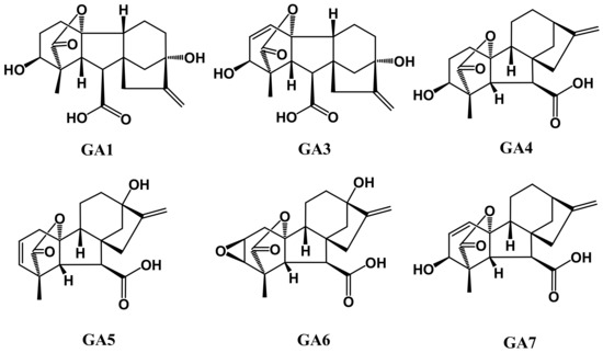 Gibberellins (gibberellic acid (GA)) were discovered in studies on fungal ascomycetes Gibberella fujikuroi on rice plants [81], which were later isolated and named gibberellins А and В [82] and subsequently detected in extracts of the marine algae genera Fucus L. [83]. The majority of gibberellins are acids and denoted by GA (gibberellic acid) followed by a number corresponding to the order in which the gibberellin was discovered. GA1, GA3, GA4, GA5, GA6, and GA7 (see Figure 4) are the most active forms [84], and the rest are their precursors. In addition, the number of gibberellins in plants can reach up to 136, while only a minority of them is biologically active. In a model plant, Arabidopsis, increased concentrations of GAs are correlative with a longer hypocotyl, activated stem elongation, earlier flowering, and inhibited seed dormancy [85,86].