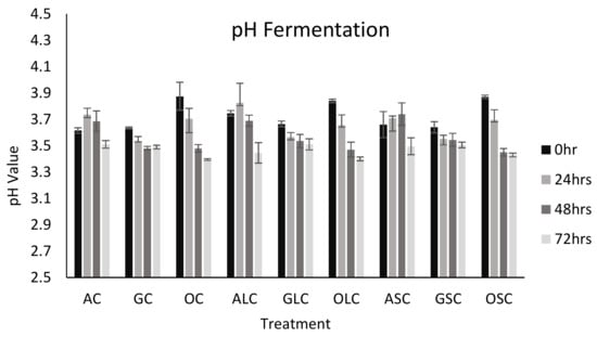 pH values of the various fruit juice samples taken over 72 h of fermentation. AC, GC, OC (apple, grape, and orange juice control); ALC, GLC, OLC (orange, grape, and orange juice with long chain inulin fiber); ASC, GSC, OSC (apple, grape, and orange juice with short chain inulin fiber).