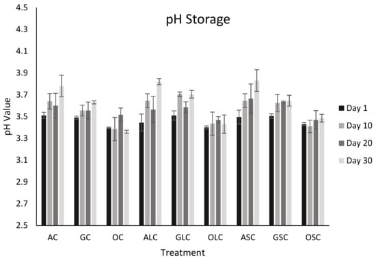 There was an increase in the pH of the fruit juices over the 30 day storage period except in orange juice samples which did not have a significant change (Figure 2). This increase in pH was likely due to the breakdown of acids. The buffering capacity of the acids in the orange juice samples, allowed the pH to remain constant [20]. For example when analyzing the change in pH amongst grape and apple cider juice samples, there was a significant increase (p < 0.05) in pH. The average pH value in GC was 3.49 (0.01) after day 1 and 3.63 (0.01) after day 30. Similarly, the pH of AC was 3.51 (0.02) and 3.78 (0.09) after day 1 and day 30, respectively. This result differed from orange juice samples which did not significantly (p > 0.05) change in pH when comparing day 10, 20, and 30 to day 1. For example, in the OLC sample, the pH after day 10, 20, and 30 was 3.43 (0.1), 3.47 (0.02), and 3.43 (0.08) respectively which compares to 3.40 (0.01) after day 1. The chain length, either short or long chain inulin fiber, did not have an effect on the pH of the juices during refrigerated storage.