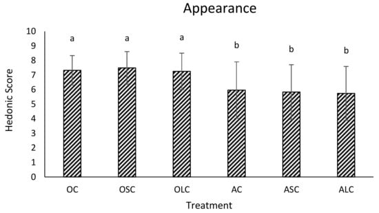 The hedonic scores (Mean SD) on the appearance of all 6 fruit juice samples from the panellists. The same letter above each bar graph indicates that there was no significant difference (p > 0.05), while bar graphs with different letters indicate that there was a significant difference (p < 0.05) according to Tukey’s studentized range test. OC, OSC, OLC (orange juice control, short chain and long chain inulin fiber).