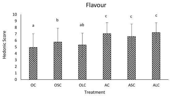 In terms of flavour, the apple cider juice samples had a significantly higher (p < 0.05) mean score for flavour compared to the orange juice samples (Figure 4). This was likely attributed to the more acidic/sour taste of the orange juice samples. There was no significant difference (p > 0.05) between OC and OLC nor between OLC and OSC; however, OSC had a significantly higher mean score compared to OC. The highest mean score for flavour was 7.23 for ALC, whereas the lowest mean score was 4.94 for OC. A hedonic score of 7 correlates with “like moderately”, while a score of 4 correlates with “dislike slightly.”
