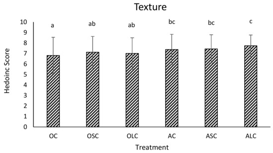 The hedonic scores (Mean SD) on the texture of all six fruit juice samples from the panellists. The same letter above each bar graph indicates that there was no significant difference (p > 0.05), while bar graphs with different letters indicate that there was a significant difference (p < 0.05) according to Tukey’s studentized range test. OC, OSC, OLC (orange juice control, short chain and long chain inulin fiber).
