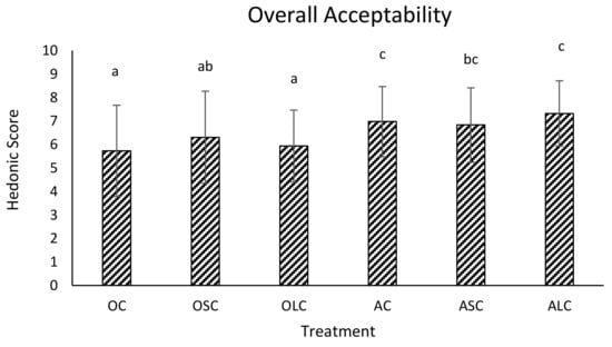 There was a significant difference in mean scores for overall acceptability between OC, OLC, and the apple cider juice samples (AC, ASC, and ALC) (Figure 6). However, there was no significant difference (p > 0.05) between OSC and ASC. The AC and ALC sample had significantly higher mean scores compared to OC and OLC. (p < 0.05) The highest hedonic score was 7.32 for ALC and the lowest mean score was 5.73 for OC. A hedonic score of 7 correlates to “like moderately”, and a score of 5 correlates to “neither like nor dislike”.