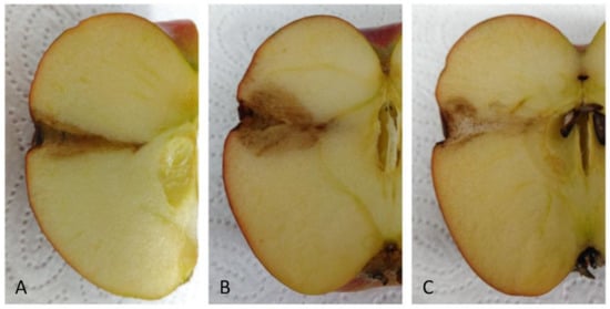 Antagonistic activity on fruits. Apple inoculated with P. odontotermitis OO5 (A), B. cinerea B16-14 (B), and P. odontotermitis OO5 + B. cinerea B16-14 (C). Inoculation with the fungual strain caused a brown lesion zone, which was significantly reduced by co-inoculation with the yeast.