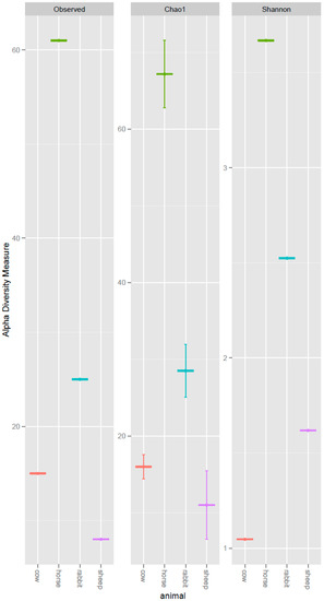 Alpha diversity measures of the deduced ACS amino acid sequences recovered from the rumens of cows and sheep, the ceca of rabbits, and the feces of horses. Observed = Observed OTU numbers; Chao1 = Chao estimator; Shannon = Shannon diversity index.