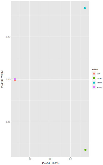 The structure of the acetogen population was also analyzed with beta diversity measures using principal coordinates analysis (PCoA). The rumen acetogens of cow and sheep clustered separately from those of the horse feces and rabbit cecum along the PCoA1, which explained 56.5% of the total variation. The acetogen populations in the horse feces and rabbit cecum also clustered separately along the PCoA2, which explained 41.8% of total variation (Figure 2).