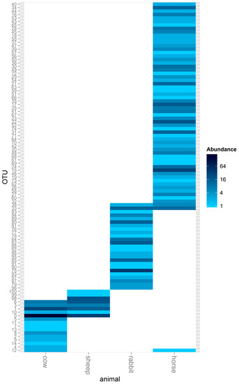 The between-group similarity was further analyzed using a heat map, and obvious differences were found in the ACS OTUs between the host animals. There were no shared ACS OTUs in the rumen of cow and sheep compared with the cecum of rabbit, and only 1 ACS OTU was shared between the rumen and feces of horse. Cows and sheep, both being ruminants, also showed obvious differences in acetogen communities, and even though 5 ACS OTUs were shared between cows and sheep, there were 10 unique ACS OTUs belonging to cows and 3 unique ACS OTUs belonging to sheep. When comparing the monogastric herbivores, rabbit and horse, there were only 2 shared ACS OTUs; 23 and 59 unique ACS OTUs belonged to rabbit and horse, respectively (Figure 3).