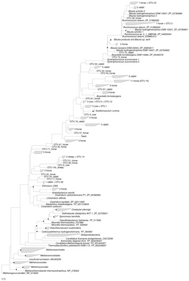 - Gagen, E.J.; Mosoni, P.; Denman, S.E.; Al Jassim, R.; McSweeney, C.S.; Forano, E. Methanogen colonisation does not significantly alter acetogen diversity in lambs isolated 17 h after birth and raised aseptically. Microb. Ecol. 2012, 64, 628–640. [Google Scholar] [CrossRef] [PubMed]