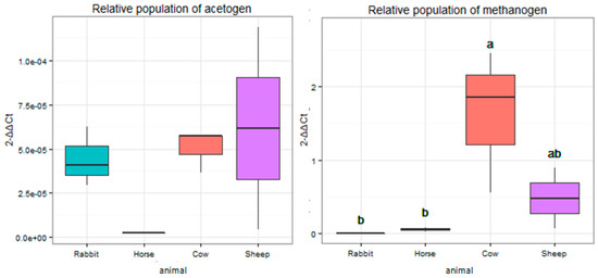 The relative abundance of the mcrA gene that targeted methanogen populations was significantly higher (p < 0.05) in the rumens of cows when compared to the ceca of rabbits and feces of horses (Figure 5). The relative abundance of the fhs gene targeting acetogen populations showed no significant difference (p > 0.05) among all the host animals (Figure 5).