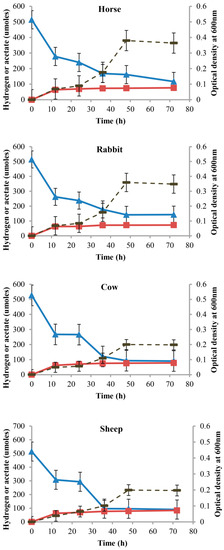 Acetate and hydrogen profiles of acetogen enrichment cultures from horse feces, rabbit cecum, and cow and sheep rumens under autotrophic conditions. Optical density (dashed line), acetate (squares), and hydrogen (triangles) profiles of acetogen enrichment cultures from horse feces, rabbit cecum, and cow and sheep rumens during growth on modified AC11.1 medium with only H2:CO2 provided as substrates. Error bars represent standard error of mean.