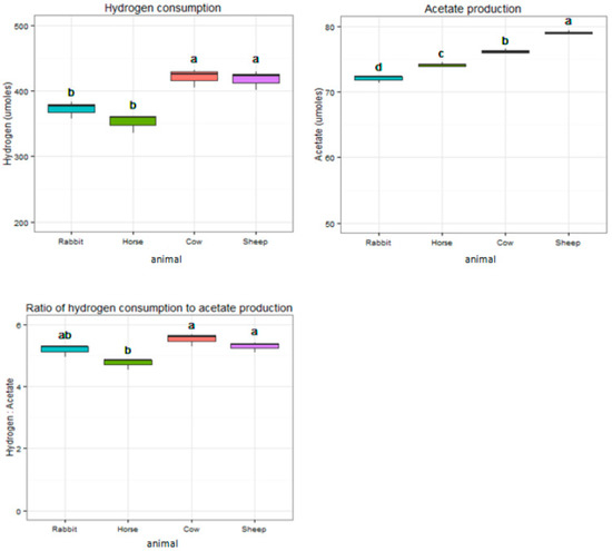 Different hydrogen consumption and acetate production characteristics of acetogen enrichment cultures from horse feces, rabbit cecum, and cow and sheep rumens during 48 h of incubation. Groups with different superscripts mean they differ significantly (p < 0.05).