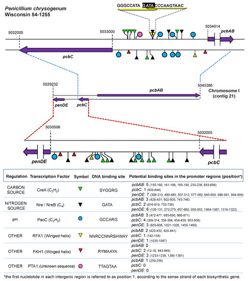 - Brakhage, A.A.; Browne, P.; Turner, G. Regulation of Aspergillus nidulans penicillin biosynthesis and penicillin biosynthesis genes acvA and ipnA by glucose. J. Bacteriol. 1992, 174, 3789–3799. [Google Scholar] [CrossRef] [PubMed]