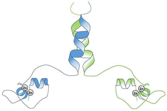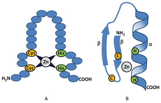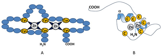 Transcription factors belong to different protein families. Belonging to the most abundant types of transcription factors are the zinc-binding proteins [14], which form one of the largest families of transcription factors in eukaryotes. These zinc-binding proteins contain amino acid sequences, so called zinc signatures or zinc finger motifs, in which cysteines and/or histidines coordinate one or more zinc atoms to form local peptide structures that are required for their specific functions. These proteins are present in all living beings, from prokaryotes (e.g., Agrobacterium tumefaciens Ros protein) to higher eukaryotes [15,16]. The zinc-binding proteins are usually classified into three major classes, and differences in the structure of proteins of the three classes are important in the recognition of their target sequences in the DNA [17]: