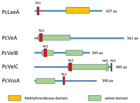 Conserved domains in PcLaeA, PcVeA, PcVelB, PcVelC, and PcVosA. Predicted nuclear localization signals (NLS, red) and putative nuclear export sequences (NES, yellow) are also indicated (adapted from [183]).