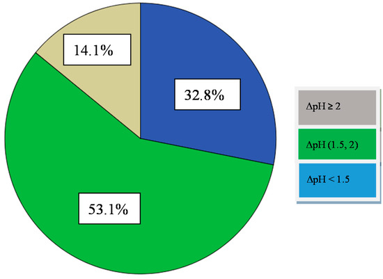 Percentage of number of isolates categorized in three acidification activity groups (low ΔpH < 1.5, medium ΔpH (1.5, 2) and high ΔpH ≥ 2) after 24 h incubation at 37 °C in 10% skim milk.